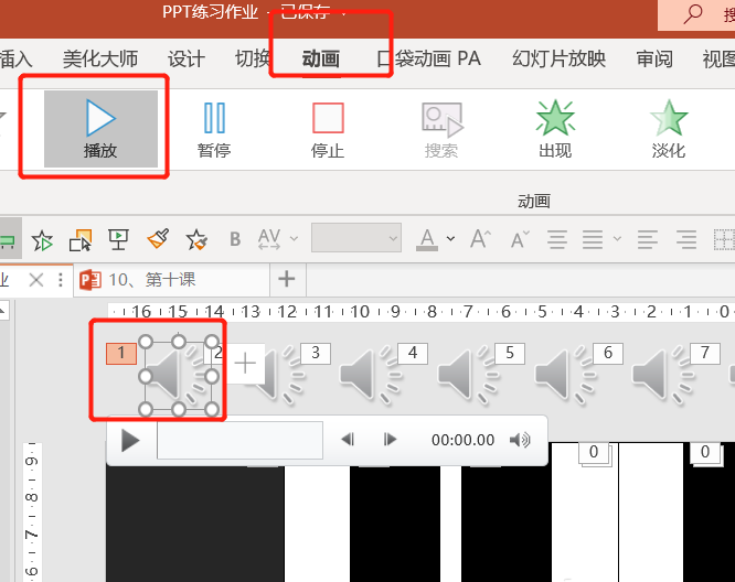 2、点击第一个音频,点击动画,点击播放,点击动画刷给其他音频添加同样的动画,如图15