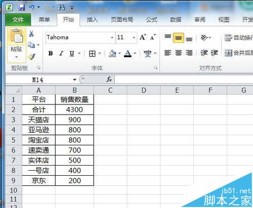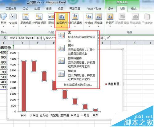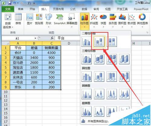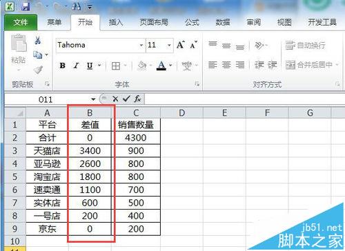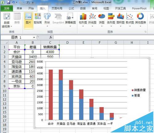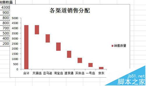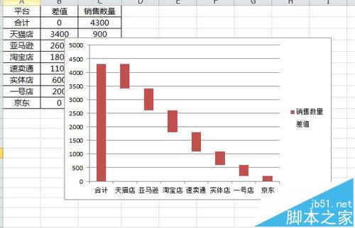 1、打开需要制作瀑布图的数据项目,例如各销售平台每日的销售数量,在销售数量列前面插入一列,最为差值补充填充列。