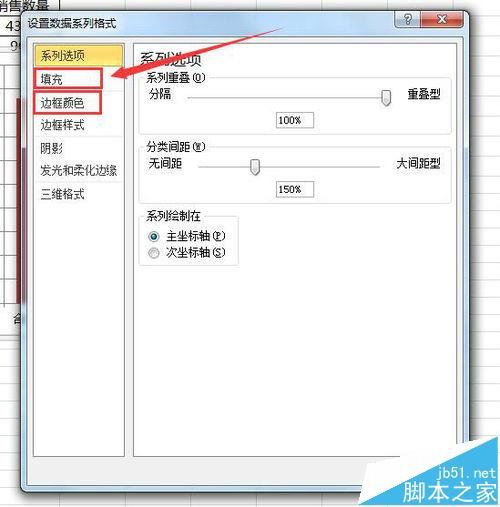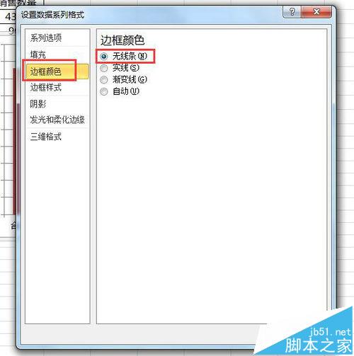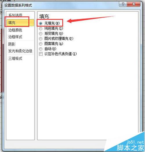 4、弹出设置数据系列格式设置框,在左侧选项中选择“填充”-“无填充”,“边框颜色”-“无线条”,点击关闭。