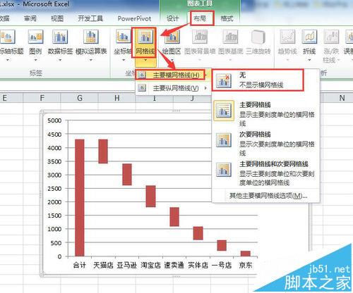5、此时,蓝色柱形部分被隐去,选择整个图表后,点击菜单栏的“图表工具”-“布局”-找到坐标轴的“网络线”,选择“主要横网络线”-“无”,去掉网络线。