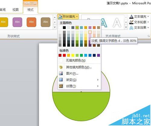5、绘图工具——格式——形状填充,为半圆填充另一种颜色,使其与原来的圆区分开。
