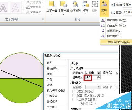 7、原位复制一根,绘图工具中选择旋转——其他旋转选项,在弹出的面板中将度数改为22.5°。复制第二根,旋转度数45……依次复制7根。