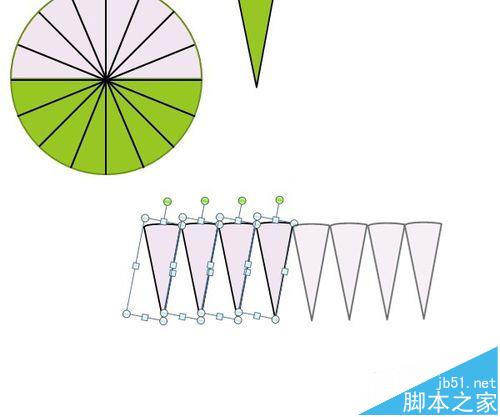 14、绿色小扇形垂直翻转,移至下方,同样复制成八个。