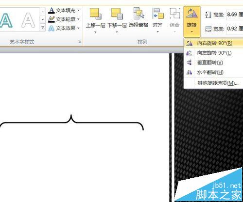 15、形状工具中选择左大括号,拉出足够大,拖动黄色变形点使边角为圆弧状,然后,在绘图工具——旋转中选择“向右旋转90°,移至所有小扇形的上方。