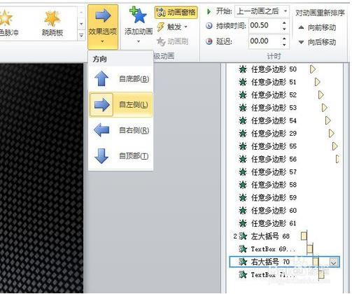 3、点击右大括号的动画,在效果选项中将方向改为“自左侧”。