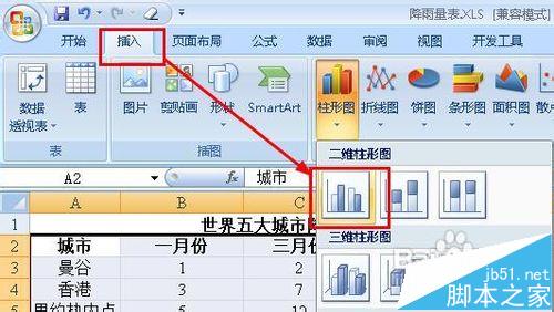 2、在菜单栏上执行:插入--柱形图,选择一种合适的样式