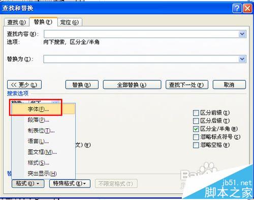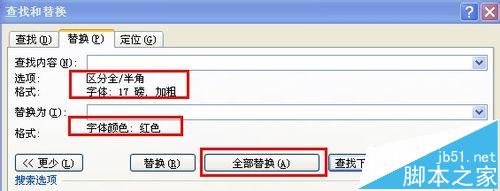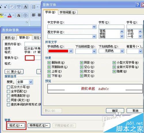 6、再点一下替换框,点“格式”下的“字体”,修改字体颜色为“红色”。