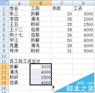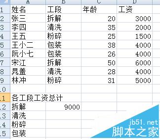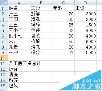 1、上表是公司人员,所属工段,年龄,工资等信息。现在要统计每个工段所有人员的工资总和。