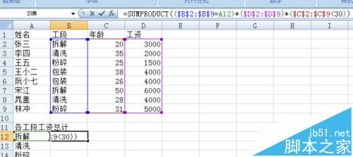4、这时,我再考虑年龄因素,统计拆解工段年龄<30岁的人员的工资总和那么在公式中,就添加($C$2:$C$9<30),用乘号*与前面的相连。整个公式为=SUMPRODUCT(($B$2:$B$9=A12)*($D$2:$D$9)*($C$2:$C$9<30))
