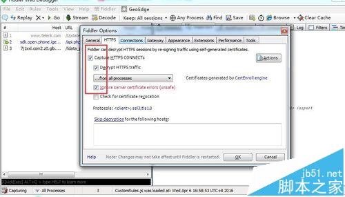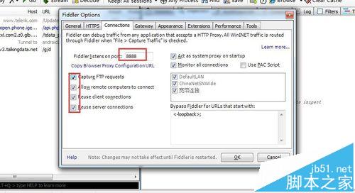 2、General标签下全部打钩、Https标签下的前三个打钩、connections标签下的全部打钩,在Fiddler listens on port这个框里填8888,