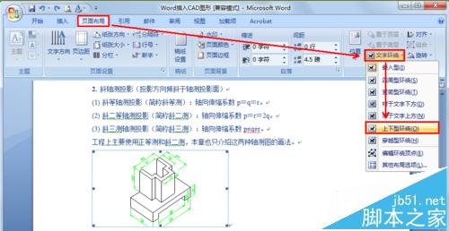 3、这时我们插入的图形在左边,怎么让它居中呢?在页面布局选项中,执行文字环绕,根据需要选择一种,比如上下型环绕。