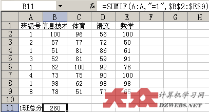 公式:=SUMIF(A:A,"=1",$B$2:$E$9) 就是对1班所有同学所有学科进行总和的统计公式。