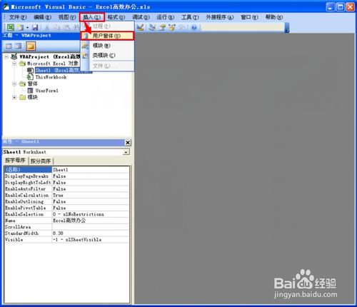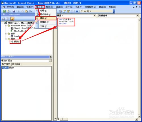 插入模块,该模块的作用是调出录入窗体(虽然窗体本身已经实现自动加载,但是不能实现二次自动加载),在Visual Basic 编辑器菜单栏里选择“插入”——“模块”,写入代码: