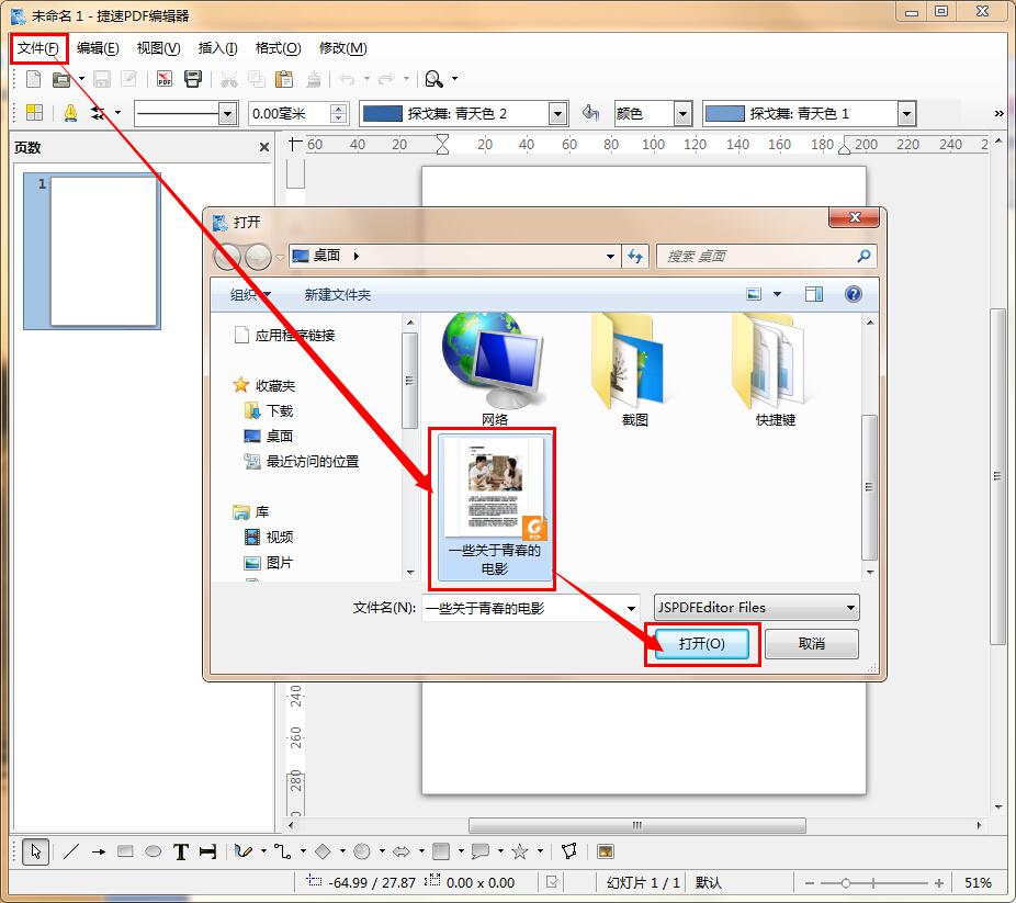 第二步,打开安装好的捷速PDF编辑器,点击“文件”——“打开”,在打开的窗口中找到要修改的pdf文件,然后点击“打开”按钮将其添加到软件中。