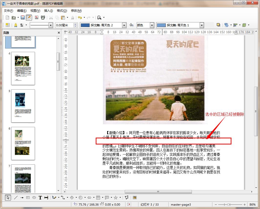 第四步,捷速PDF编辑器可以选择、插入、修改、删除、旋转、复制、粘贴文字、图像和图形,插入、导入、导出、删除页面,还可以对版面进行编辑,具体的功能需要用户在使用的过程中自行发掘。这里我们以删除为例,来看看具体的效果。