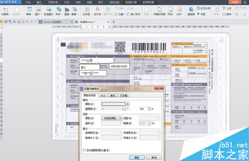 4.信息输入完毕后,发现文本框为白色背景和快递单并不协调。右击文本框”设置对象格式“,按如图设置。