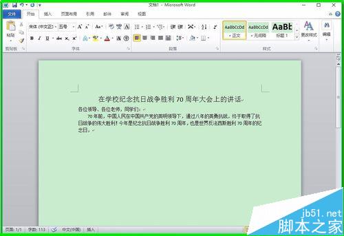 2、输入标题:在学校纪念抗日战争胜利70周年大会上的讲话,按Ctrl+E键使标题居中;