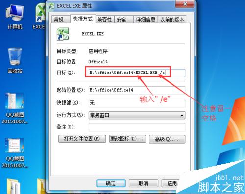 5、在目标位置输引号里内容:“ /e”
