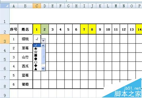 3、在表格空白处,将考勤各项目对应的符号列出来。然后,选中C3,点击【数据】-【数据有效性】,在弹出的对话框中,允许下选择【序列】,数据源选择列出来的考勤项目符号,按【回车/enter】-【确定】,即可看到C3的下拉菜单显示出考勤项目符号。