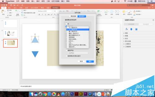 8、找到链接一栏,往下拉有链接到下一张,点击,确定,同样的方法制作下面一个按钮,不过有细微的不同,就是链接时是链接到幻灯片,选取第三张