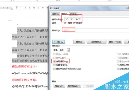 3、在查找内容中输入(<[!^13]*^13)(*)\1,替换为\1\2,使用通配符,全部替换。