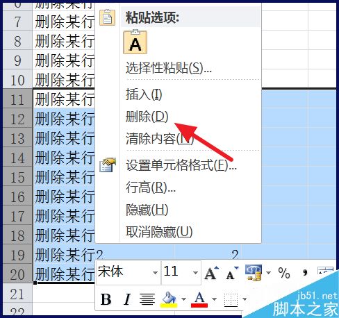 7、接着选中【删除某行2】的所有行,右击删除即可
