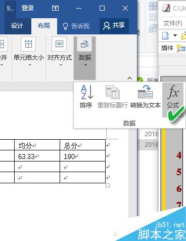 将光标置于总分一列下第一人的单元格中,选择“表格工具”下的“布局→公式”项。