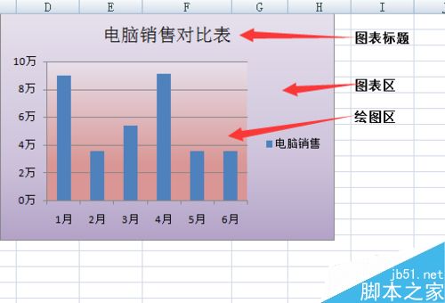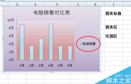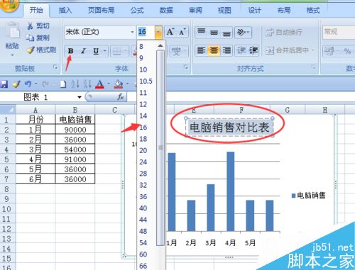 双击图表标题区—在“电脑销售”后面再输入“对比表”—输入完后,选中标题“电脑销售对比表”—将加粗去掉,并把其字号设置成合适的大小;