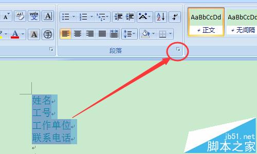 2、选中文字,单击开始选项卡中的段落组右下角按钮。