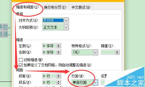 3、在段落对话框中的第一个页签“缩进和间距”中的间距里,行距由单倍行距改为成1.5倍行距。