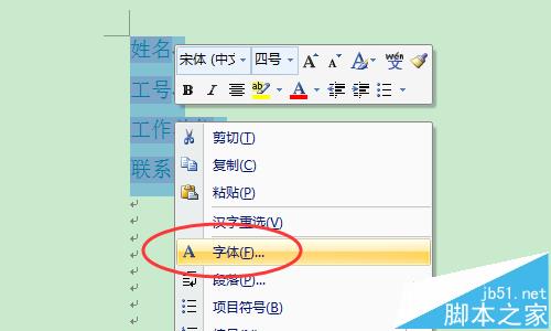 4、修改行距之后,仍然选中项目,右击选择字体。