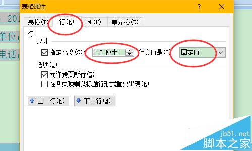 10、在表格属性对话框中,将行高设置成1.5厘米