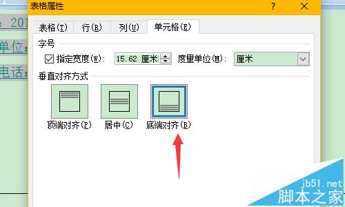 11、同样在表格属性对话框中,单元格页签,设置表格文字的垂直对其方式,设置成底端对齐。
