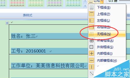 13、我们选中表格,在设计选项卡中,在边框中先选择无框线。
