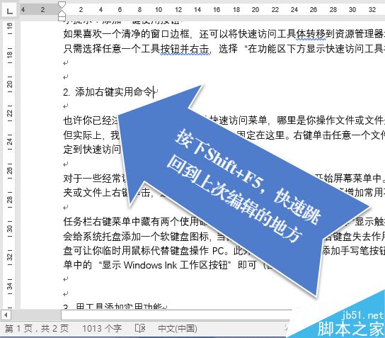 一篇有很多页的长文档,如果在某页中编辑之后,又跳到另一页编辑,之后忽然想起前面的编辑还有问题,如何快速跳转到前面的编辑点呢?滚动吗?或许你哗哗哗转半天滚轮,还是没找到那个地方。现在,只需按下Shift+F5,就可以快速跳回到上次编辑的地方了。这就叫神速!