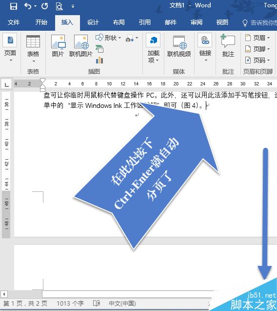 一章内容写结束了,要另起一个新页写另一章了,需要一次次地按回车到下页吗?其实还有更好的方法,按下Ctrl+Enter就能一下子搞定。