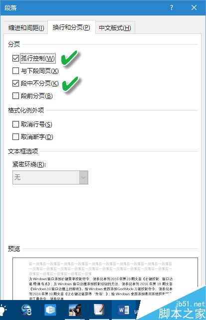 有时候我们的文档剩下一行或几行却排在最后一页中,显得很浪费纸张。这时,如果在“段落”设置的“换行和分页”选项卡中选择“孤行控制”和“段中不分页”复选框,那么整个版面将自动重排,后面的一行或几行将缩回到上一页中,省出一页纸张。