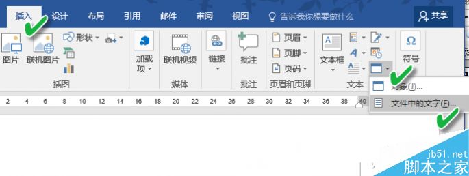 如果要将多个Word文件中的内容插入到当前的文档中,只需依次点击“插入→对象→文件中的文字”。