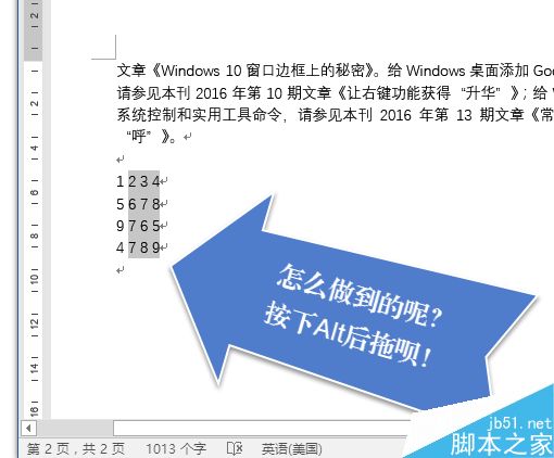 如果在一篇文章中,希望选择文本中的某个矩形区域而不是整行或整列,可在按下Alt不放的同时,用鼠标拖动操作选择矩形区域。