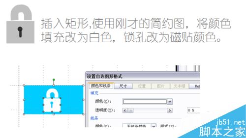 5、插入矩形,使用刚才的简约图,将颜色,填充改为白色,锁孔改为磁贴颜色。