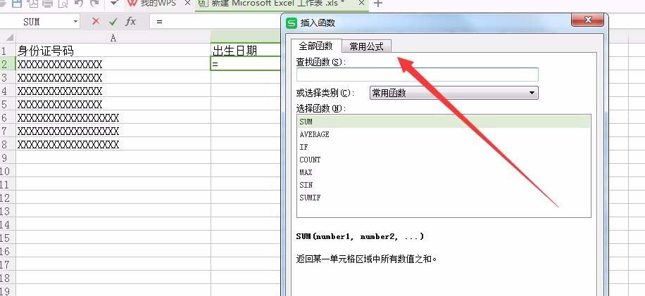 3、鼠标左键单击【fx】,进入插入函数,点击常用公式,切换到【常用公式】窗口界面,如下图所示