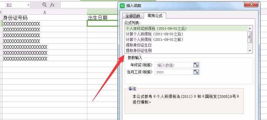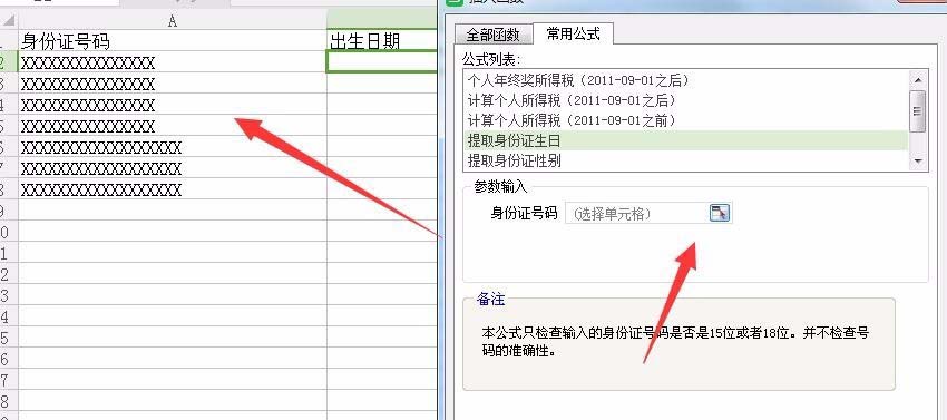 4、在【常用公式】窗口界面中,选择【提取身份证生日】,然后选择单元格。如下图所示