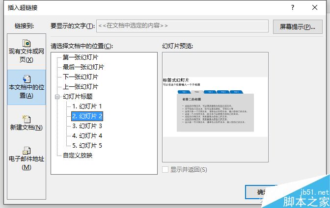 右击这个近乎透明的矩形块,从右键菜单中选择“超链接”,在弹出的插入超链接对话框中,最左侧选中“本文档中的位置”,再在中间栏选择对应此标签的“幻灯片2”。
