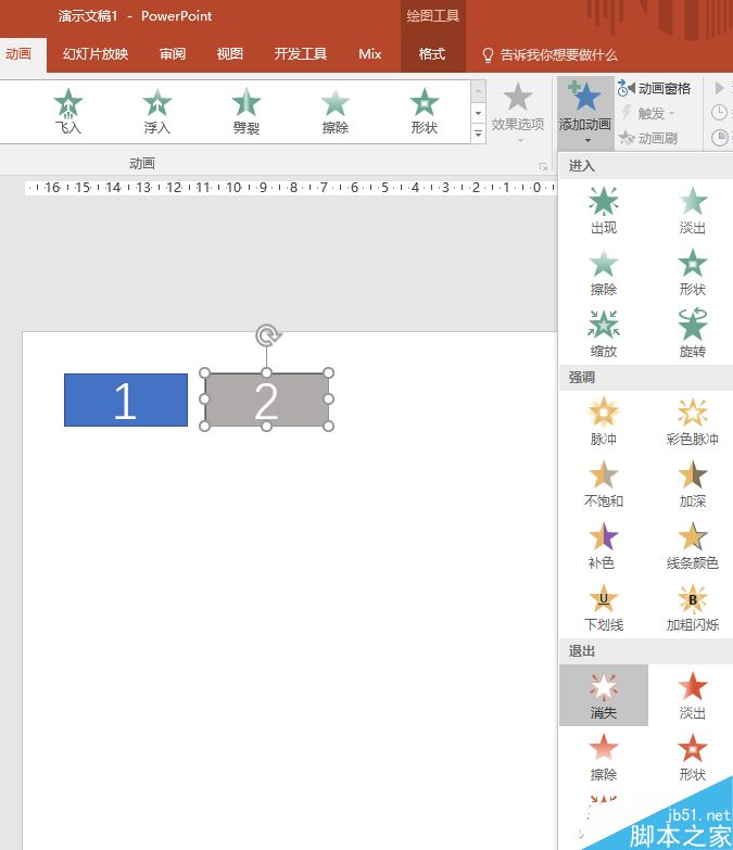 现在选中灰色的矩形,然后切换到“动画”选项卡,点击“添加动画”,从弹出框中选择“退出”中的“消失”。