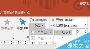 此时灰色矩形旁会多出一个“1”的红色框,表示它已有一个动画设置。继续选中灰色框,然后点击工具栏上的“触发”,从弹出框中继续选择“单击→矩形3”,这里的矩形3实际就是蓝色框。