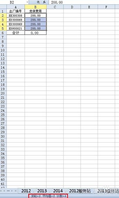 打开文件,通过函数=SUM(B2:B5),结果为0,如图: