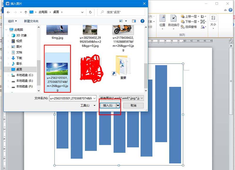 6、单击图片后打开一个对话框,我们选中图片并单击插入