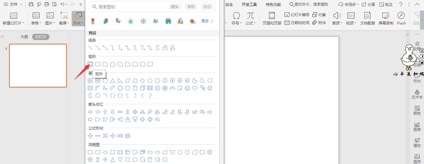 在插入选项卡中点击形状,选择其中的矩形,在页面上绘制出形状。
