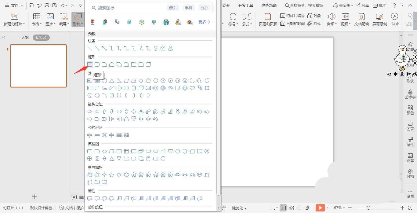 1、在插入选项卡中点击形状,选择其中的矩形。