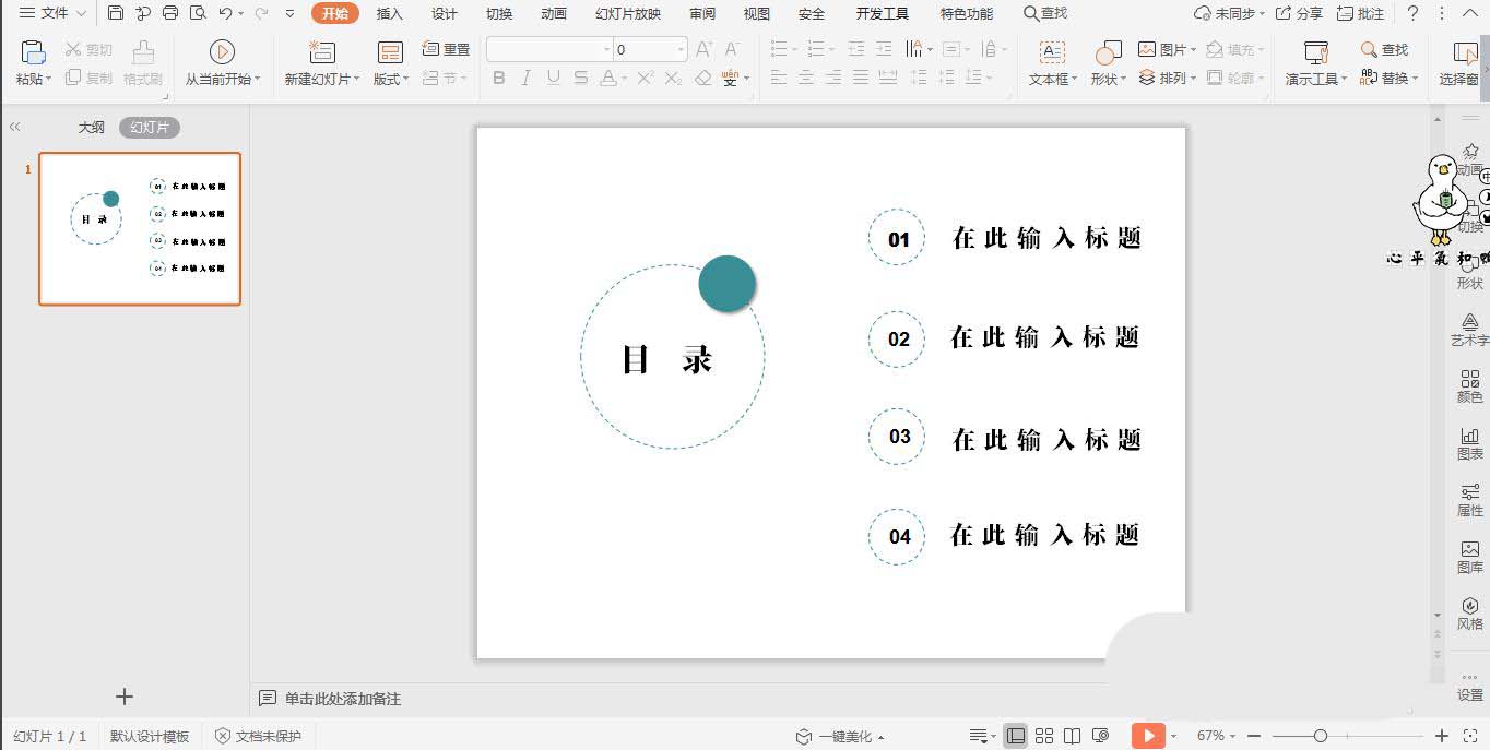 6、在大圆形中间输入“目录”,在页面的右侧输入目录的标题,这样虚线圆形目录就制作完成了。